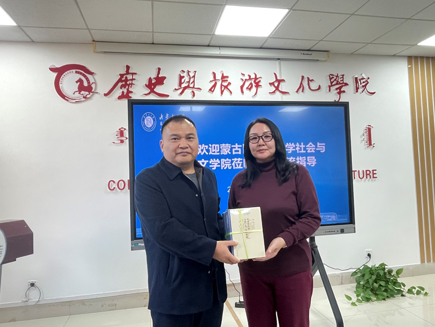 蒙古国图古勒德尔·央吉布院长介绍了其学院发展历程、专业设置、师资队伍、招生规模、实习实践以及国际交流合作情况,表达了加强合作的意愿,希望通过教师短期访学、讲座、科研合作、学生交流交换、学生短期实习等形式开展全面深入合作,共同推动中蒙高等教育事业的繁荣发展。历史旅游与文化系系主任娜仁萨楚拉进一步介绍了学院的办学规模、博士、硕士学位点设置以及国际学术交流合作等相关情况,提出未来双方可以在学术论文发表、中蒙联合考古发掘、硕博联合培养等方面开展广泛合作。