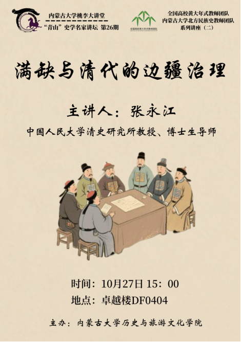 10月27日下午,历史与旅游文化学院主办的“青山”史学名家讲坛第26期讲座顺利举行,本次讲座也是全国高校黄大年式教师团队——内蒙古大学北方民族史教师团队系列讲座的第2讲。本次讲座特邀主讲人为中国人民大学清史研究所教授、博士生导师张永江教授。张永江教授现任中国清史南方研究院(苏州工学院)教授、国家清史编纂委员会专家,兼任中国蒙古史学会会长、人大报刊复印资料《明清史》编委会主任等,在北方民族史及蒙古史、清史、清代边疆民族史等研究领域成果卓著。