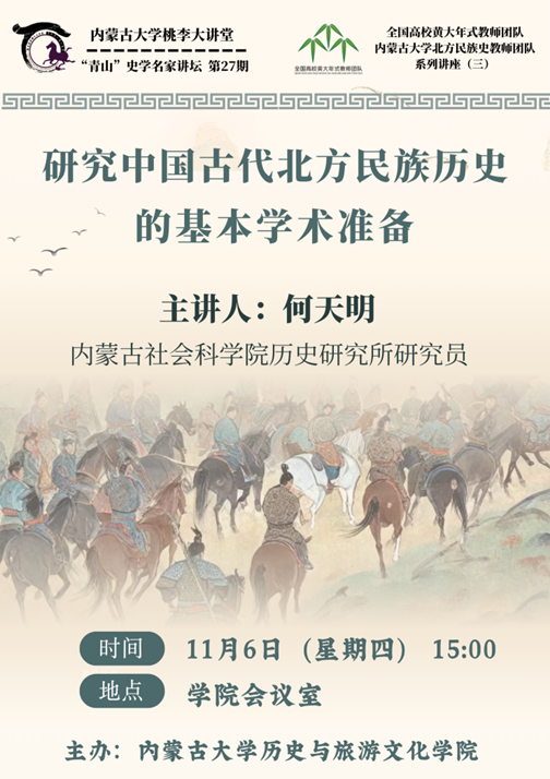 11月6日下午,历史与旅游文化学院主办的“青山”史学名家讲坛第27期讲座顺利举行,本次讲座也是全国高校黄大年式教师团队——内蒙古大学北方民族史教师团队系列讲座的第3讲。本次讲座主讲人为内蒙古社会科学院历史研究所何天明研究员,题目为《研究中国古代北方民族历史的基本学术准备》。讲座由全国高校黄大年式教师团队——内蒙古大学北方民族史教师团队负责人张久和教授主持,团队成员及学院师生共同参加。